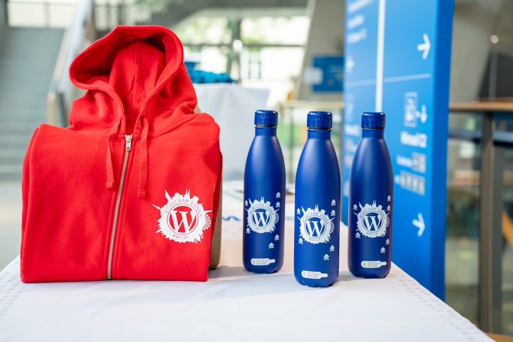 Die langlebigen WordCamp-Trinkflaschen wurden bewusst nicht an alle verteilt, sondern gezielt an Speaker:innen vergeben – als kleines Dankeschön für ihren Einsatz.